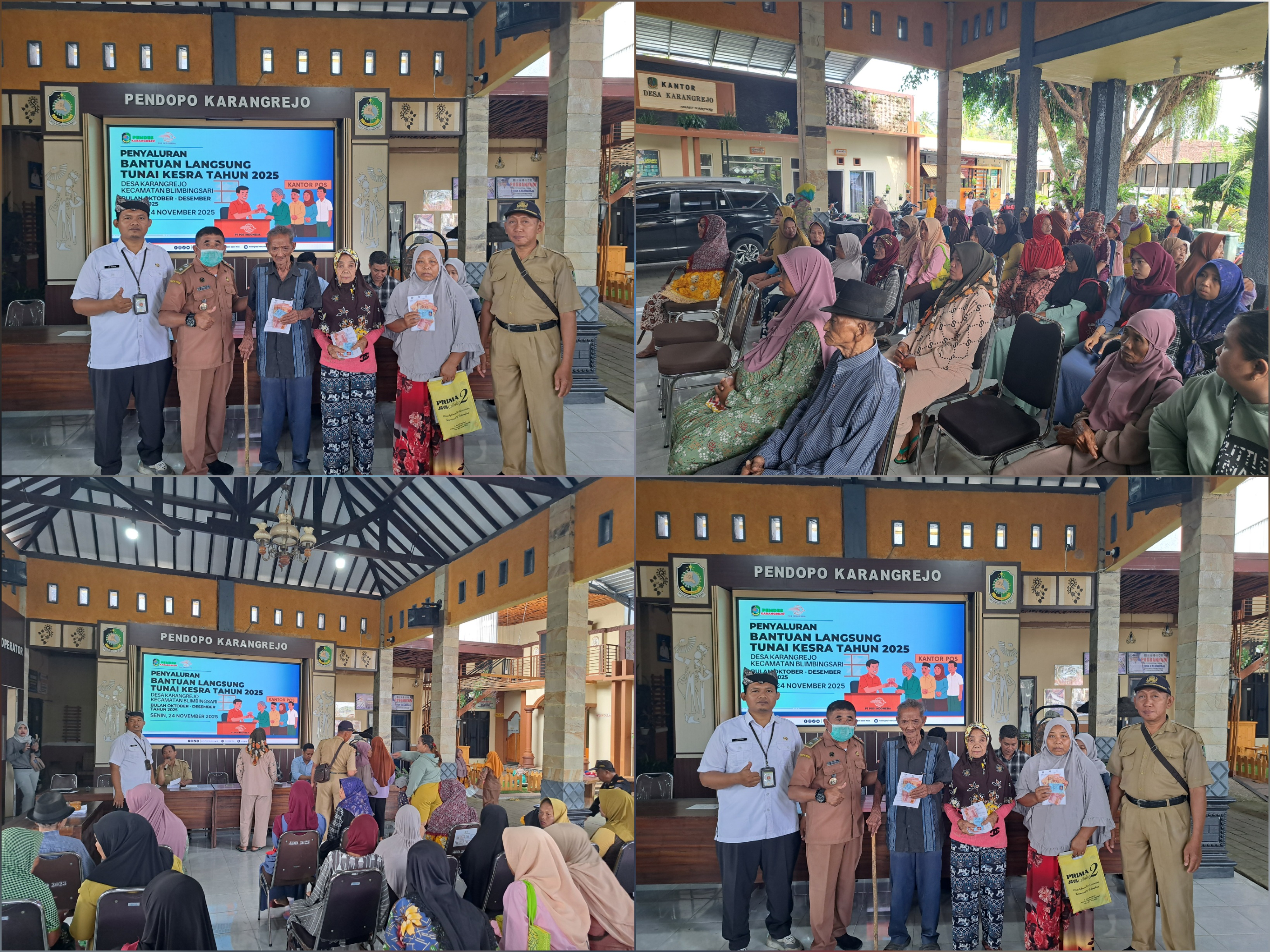 Pada hari ini Senin tanggal 24 november tahun 2025 di Pendopo Desa Karangrejo telah dilaksanakannya Penyaluran Bantuan Langsung Tunai Kesra Tahun 2025, Total bantuan yang disalurkan yaitu bulan Oktober – Desember mencapai Rp 900 ribu per Keluarga Penerima Manfaat (KPM) atau 300 ribu perbulannya.